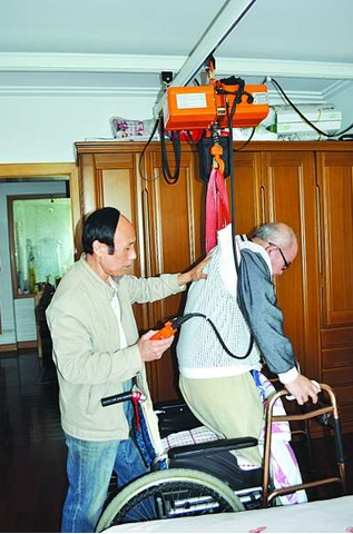 這位高位截癱的老人名叫黃道隆,家住空付司巷的百步街社區,今年已經69歲。據了解,10多年前的一天,黃老不慎在家中摔了一跤,便成了高位截癱的病人,自此之后的歲月就一直是在床上度過的。這十年來,黃老不但生活上不能自理,就連想從床上坐起來也得請別人搭個手。黃老整日只能與輪椅和床為伴,這讓他痛苦不已,人也變得消極沉默寡言了不少。幾個月前,蘇州一家起重機械有限公司的老總吳先生正巧從百步街社區經過,了解到了黃老現在的處境,著實生了憐憫之心,于是便尋思著利用自己公司的技術,為黃老量身定制一套“微型吊車”。緊接著吳總就指派工程師到黃老家上門測量、安裝。工程師根據黃老家里房間的具體情況,將兩根合金鋼導軌安裝在了墻上,又在它們中間配用了一臺單向電源的微型電動葫蘆。只要按一按電鈕,就能把黃老從床上輕松地吊到輪椅上。